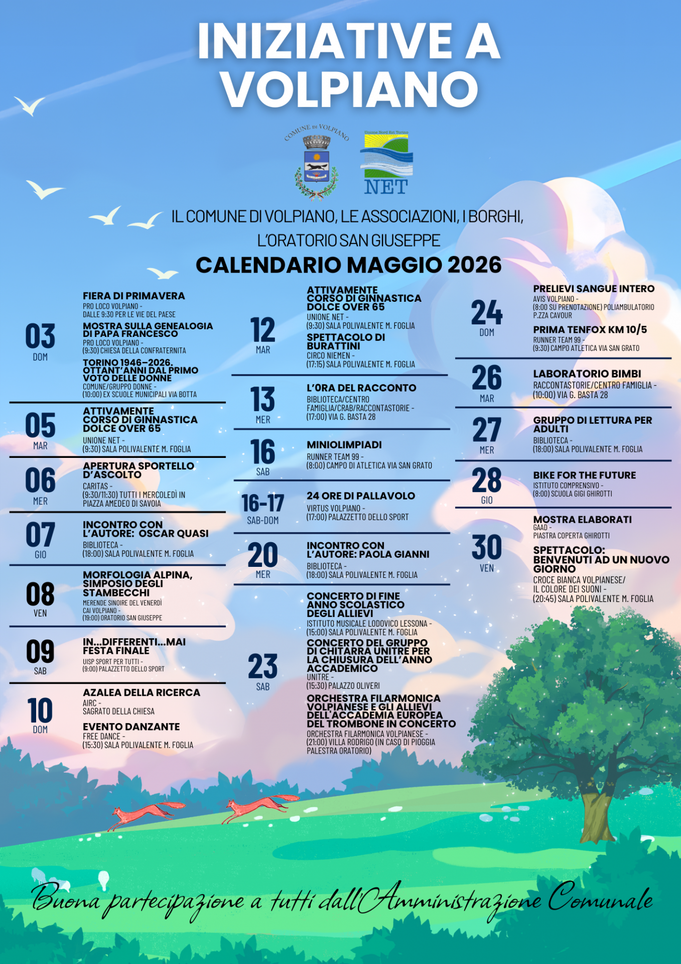 Il mese di maggio a Volpiano si presenta ricco di appuntamenti dedicati alla cultura, allo sport, alla solidarietà e alla partecipazione della comunità.