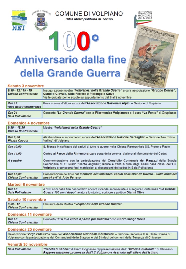 Il Gruppo Donne Volpiano, con Aldo Ferrero, Claudio Giovale e Pierangelo Calvo, propone nel centenario della fine della prima guerra mondiale una mostra di fotografie, documenti, diari e ricordi di volpianesi che hanno partecipato a questi avvenimenti.