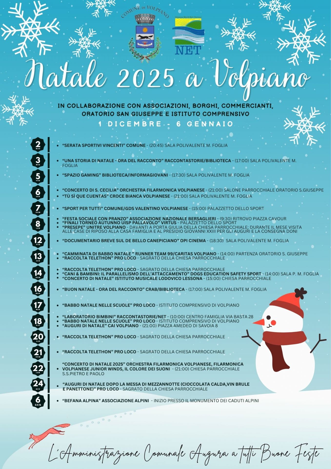 L’Amministrazione Comunale di Volpiano, in collaborazione con associazioni, borghi, commercianti, Oratorio San Giuseppe e Istituto Comprensivo, è lieta di presentare il ricco calendario di iniziative natalizie che accompagnerà il paese dal 1° dicembre 2025 al 6 gennaio 2026.