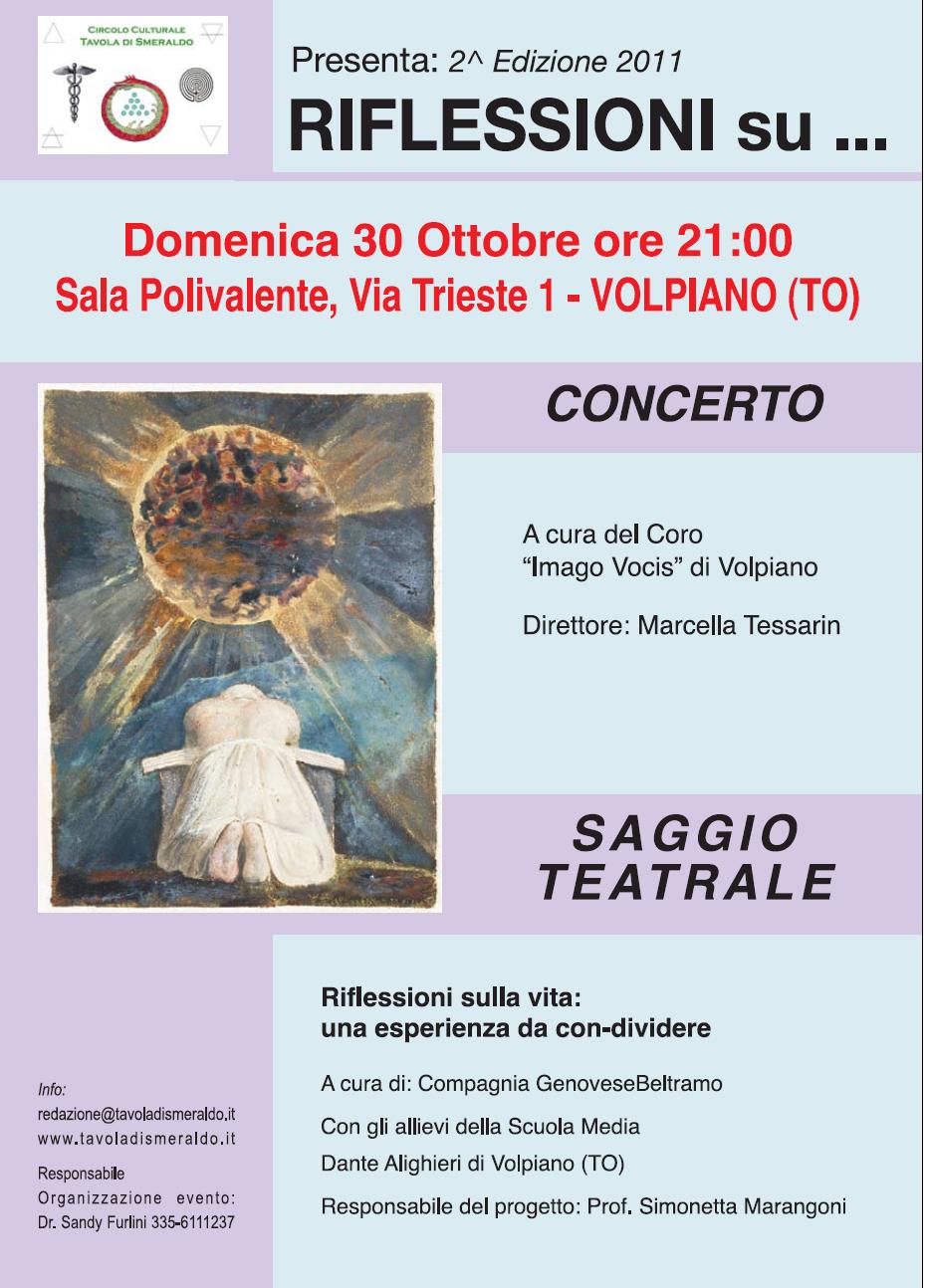Il Circolo Culturale Tavola di Smeraldo, nell'ambito del convegno - " Riflessioni sulla vita:un'esperienza da con-dividere, organizza, presso la sala Polivalente di via Trieste,1 un concerto a cura del Coro "Imago Vocis" di Volpiano, a seguire, un saggio teatrale, ideato dalla Compagnia Genovese Beltramo, con gli allievi della Scuola Media D.Alighieri di Volpiano.