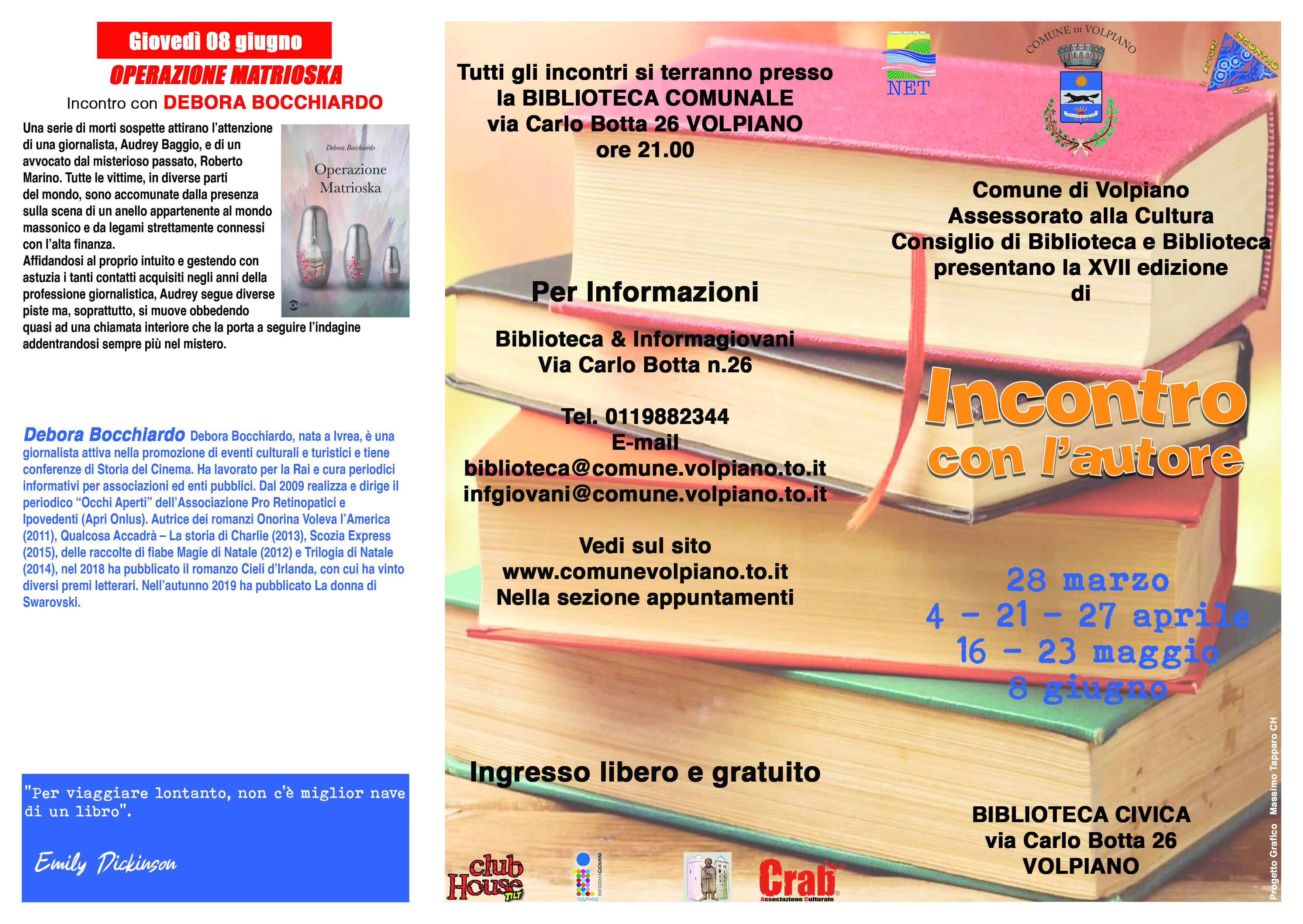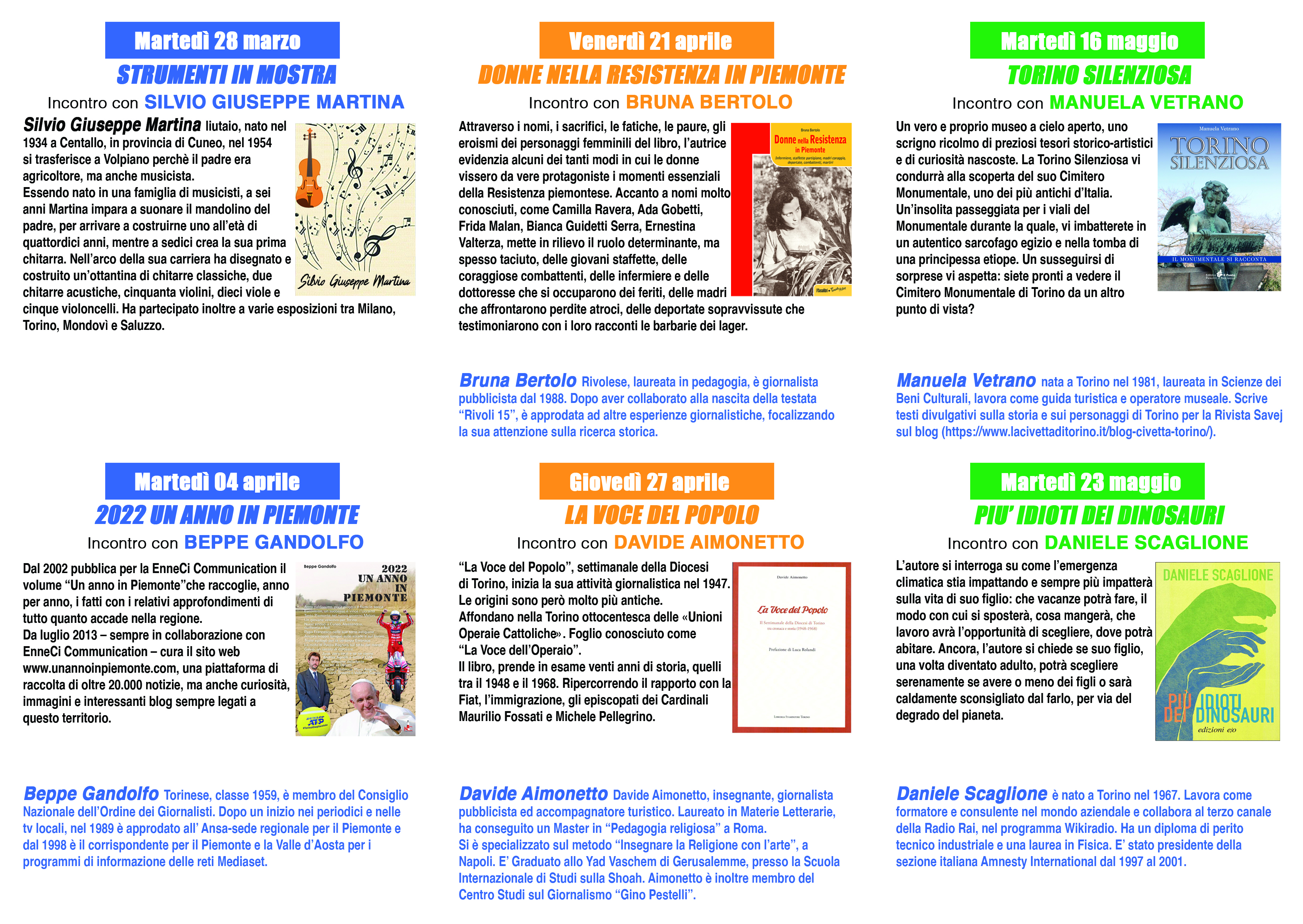 La rassegna prosegue martedì 4 aprile con il giornalista Beppe Gandolfo e il suo libro «2022. Un anno in Piemonte», venerdì 21 aprile con Bruna Bertolo e le «Donne nella Resistenza in Piemonte», giovedì 27 aprile il giornalista Davide Aimonetto ripercorre la storia del settimanale «La Voce del Popolo», martedì 16 maggio Manuela Vetrano racconta la «Torino silenziosa» del Cimitero monumentale, martedì 23 maggio Daniele Scaglione s’interroga sull’emergenza climatica con «Più idioti dei dinosauri», mentre giovedì 8 giugno la giornalista e scrittrice Debora Bocchiardo presenta il suo romanzo «Operazione Matrioska».